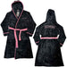 Black super soft fleece hooded robe in towelling with pink piping & belt. Logo on breast and back.
