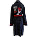 Black super soft fleece hooded robe with contrasting red piping & belt. Features embroidered design motifs to front & back.