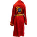 Red hooded robe in super soft fleece toweling with yellow piping and belt with sun icon on front breast and back.